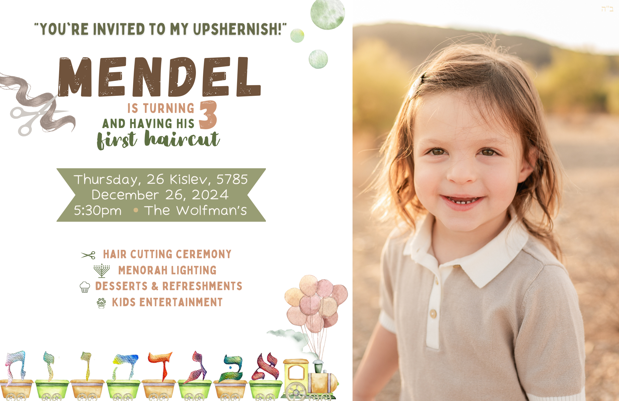 Please join us in celebrating Mendel’s third birthday & Upshernish. The celebration will be in our home on Dec. 26th at 5.30pm. Kindly RSVP below. We are looking forward to welcoming you!